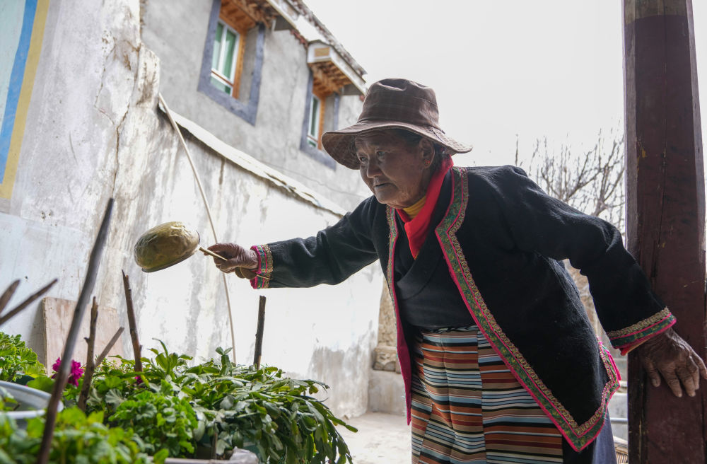 卓玛吾珠在家中给花浇水(3月16日摄)。