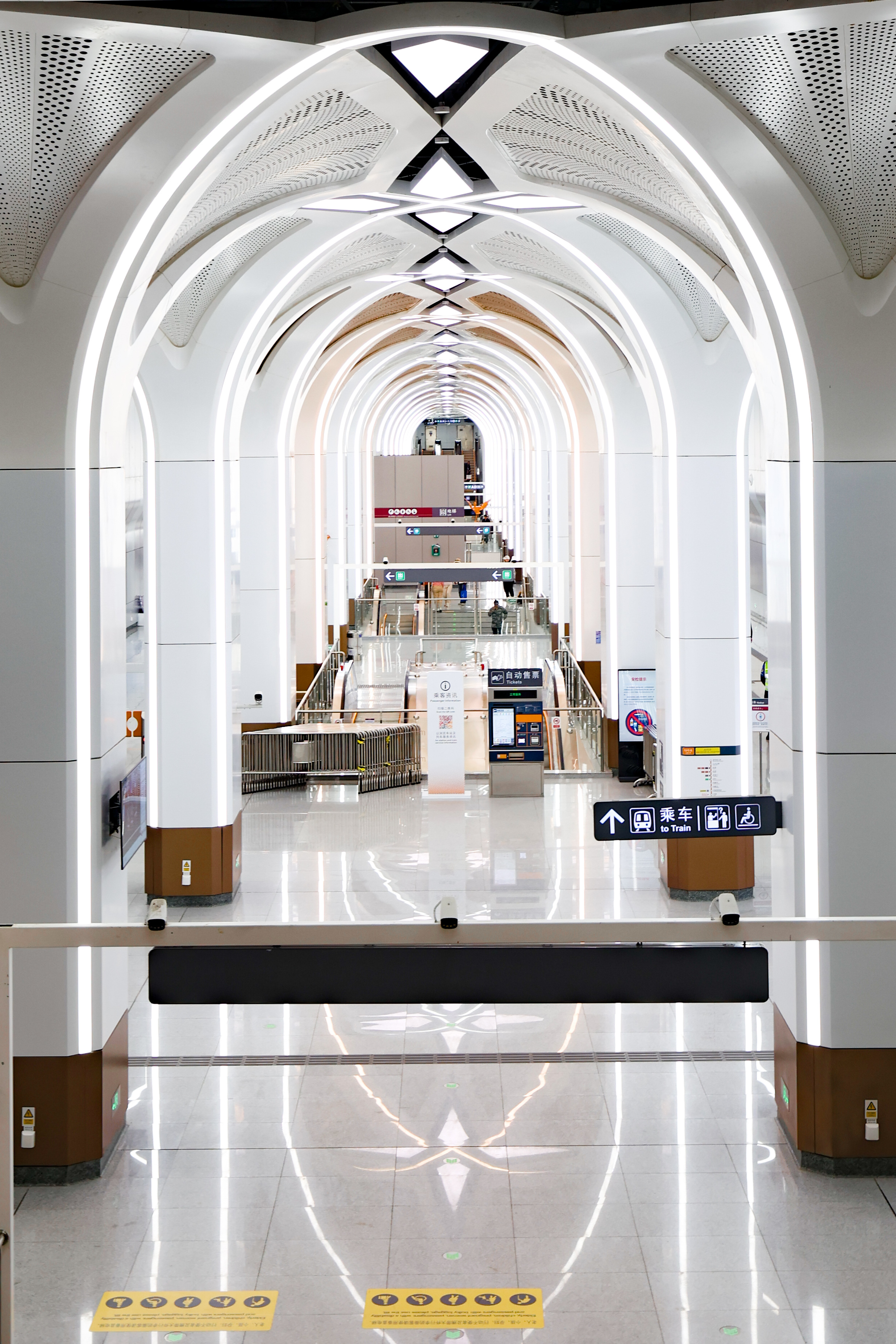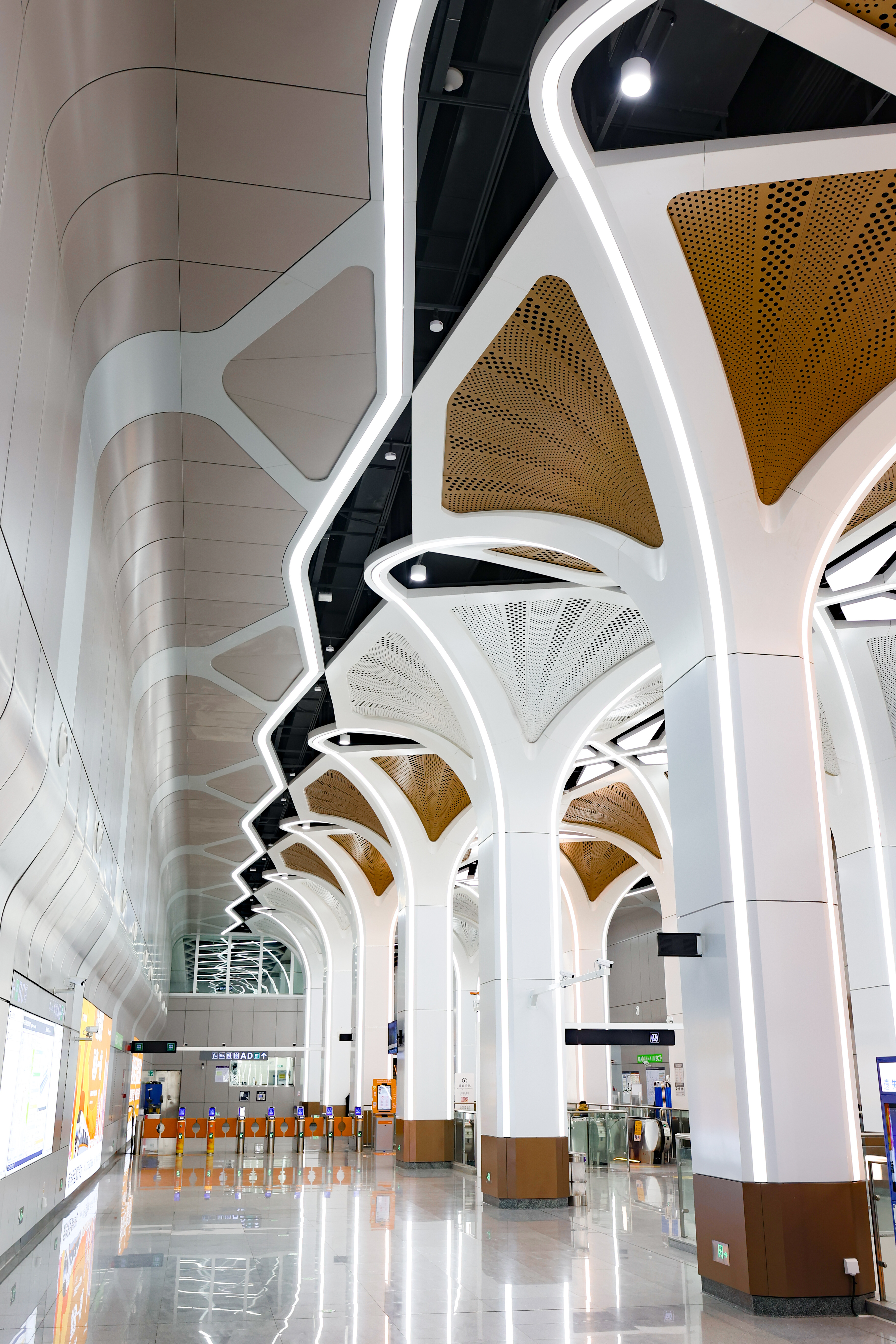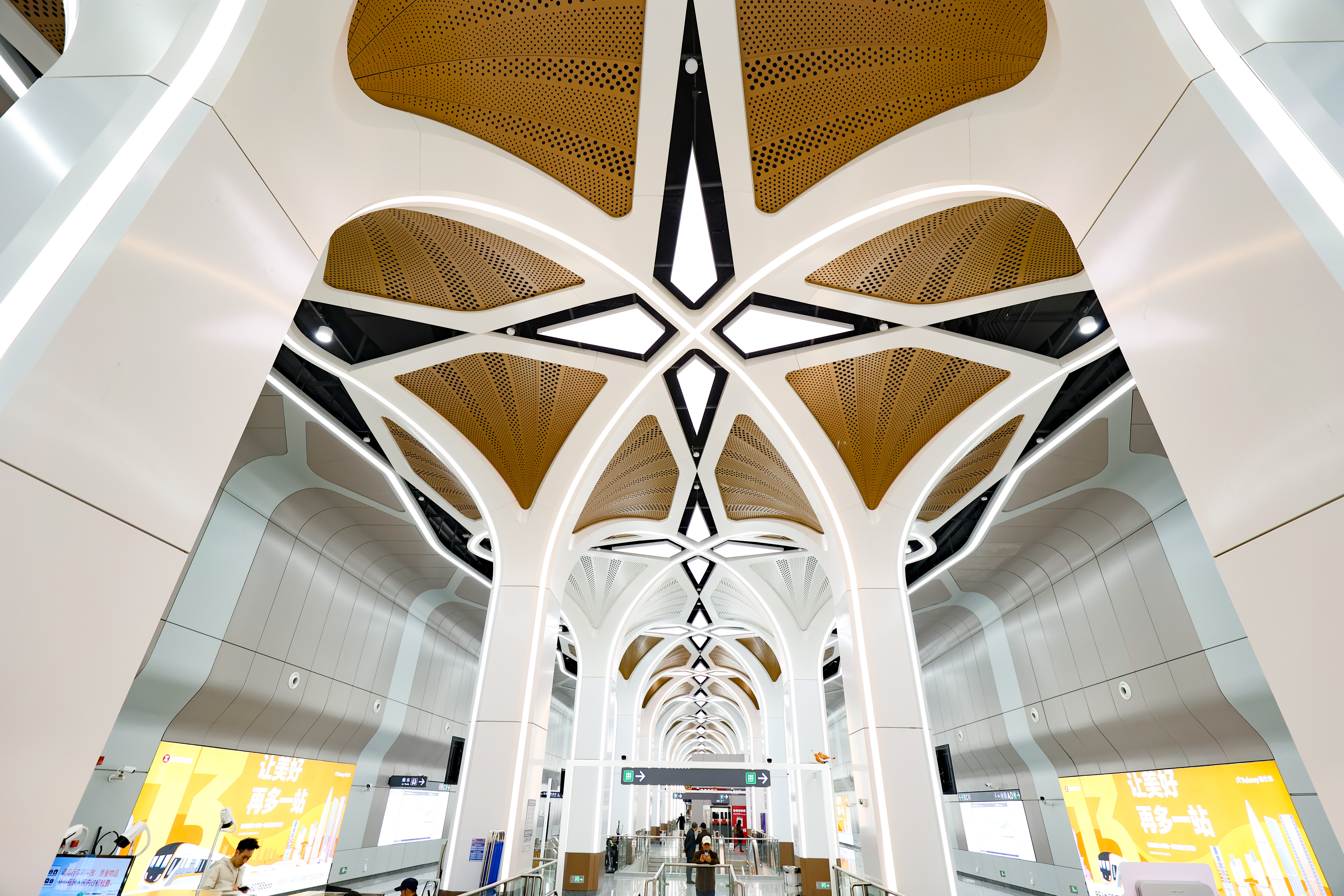 石饱读站毗邻大疆天外之城总部等科创研发集合区,车站诡计上融入当代科技元素与未来感,以畅通线条为基底,会通金属质感与科技光影元素。顶部几何结构灵感源自无东说念主机流线型机身和旋转螺旋桨,联接LED灯,往还就会自动变换光影,斗鱼体育app 宛如“巨型穿梭机”的空间主体,诱骗多数市民旅客专程赶赴打卡,将“让好意思好更多一站”的理念具象呈现。
