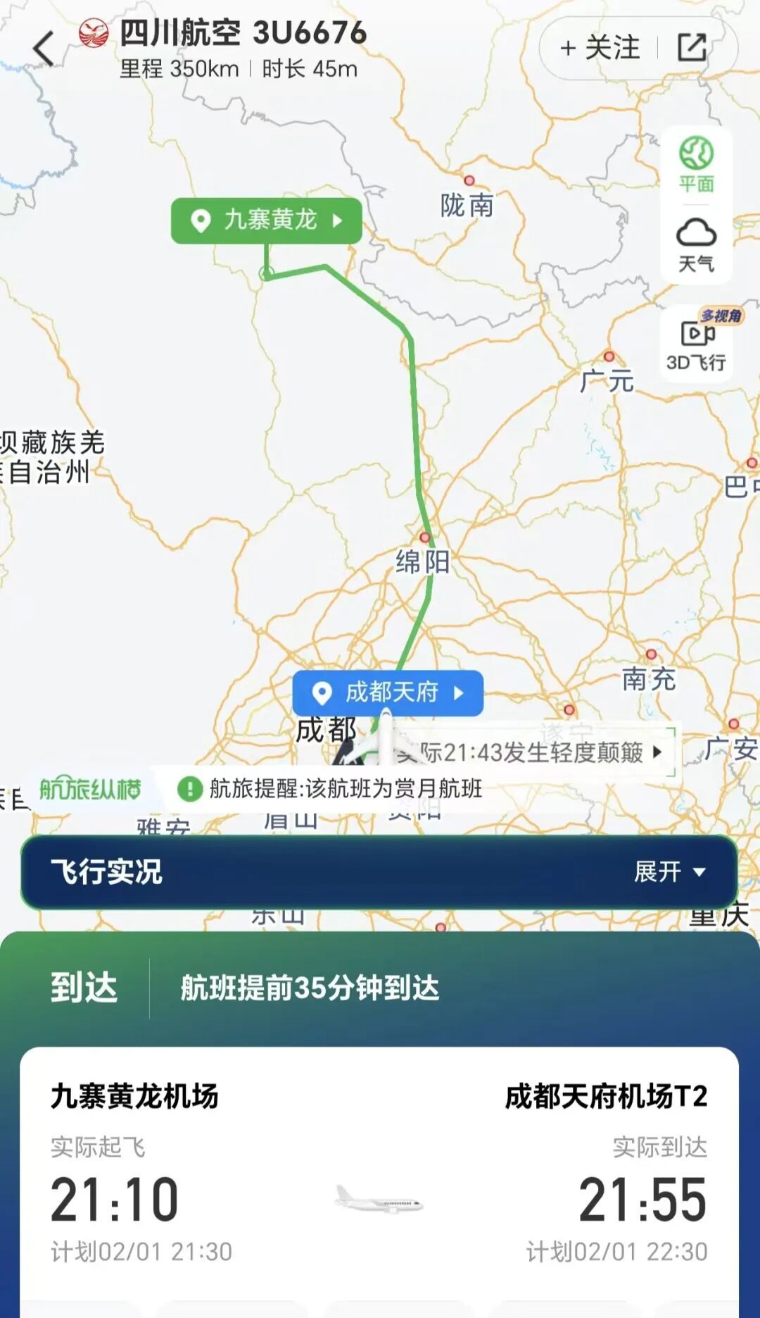 2月5日,界面新闻查询航旅纵横APP获悉,3U6676在2月1日当晚9点10分升空,当晚9点55分到收场齐天府机场,比原定策画提前35分钟到达。