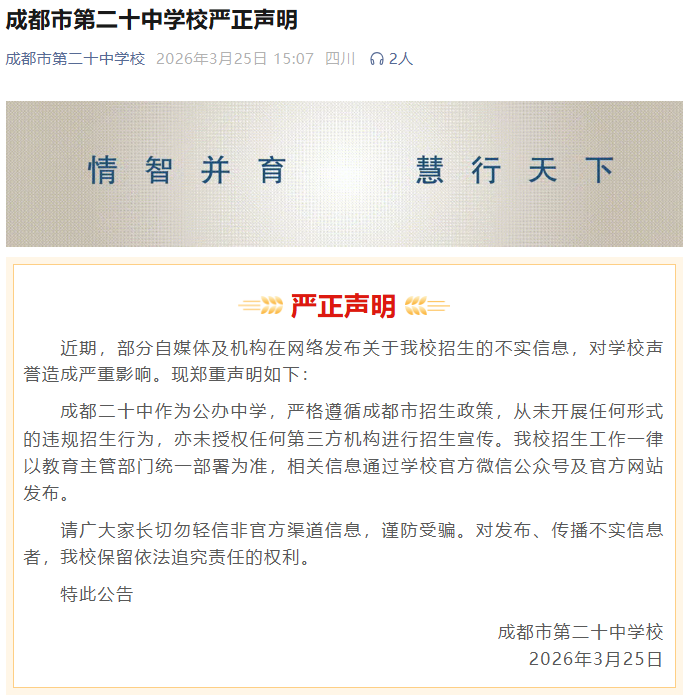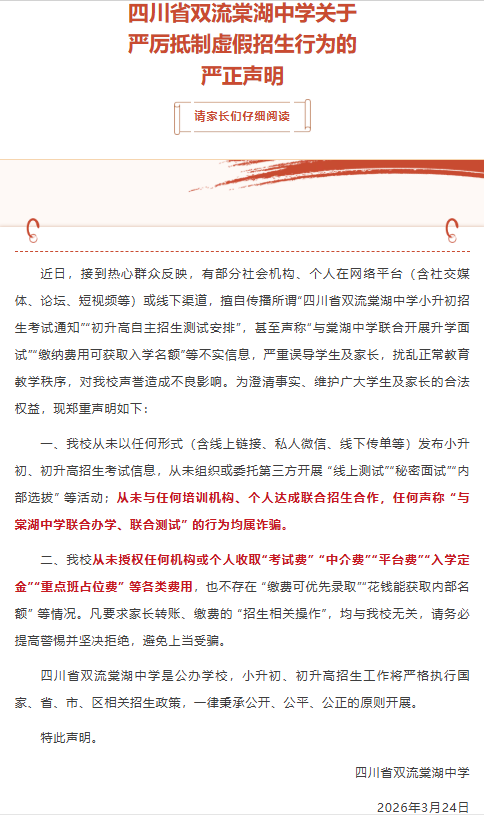 学校明确,从未以任何形状(含线上谐和、私东说念主微信、线下传单等)发布小升初、初升高作生陶冶信息,从未组织或托付第三方开展 “线上测试”“神秘口试”“里面遴荐” 等作为;从未与任何培训机构、个东说念主已毕谐和招生协调,任何宣称 “与棠湖中学谐和办学、谐和测试” 的行径均属欺诈。