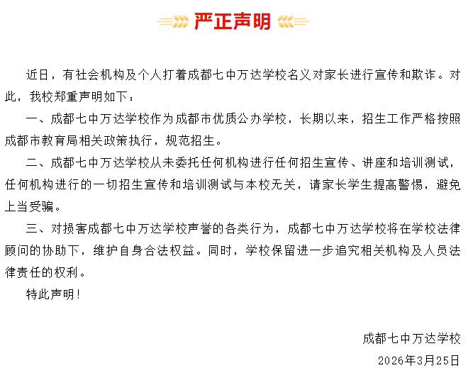 成齐七中万达学校发布的声明中提到,该校从未托付任何机构进行任何招生宣传、讲座和培训测试,任何机构进行的一切招生宣传和培训测试与本校无关,请家长学生普及警惕,幸免上当上当。