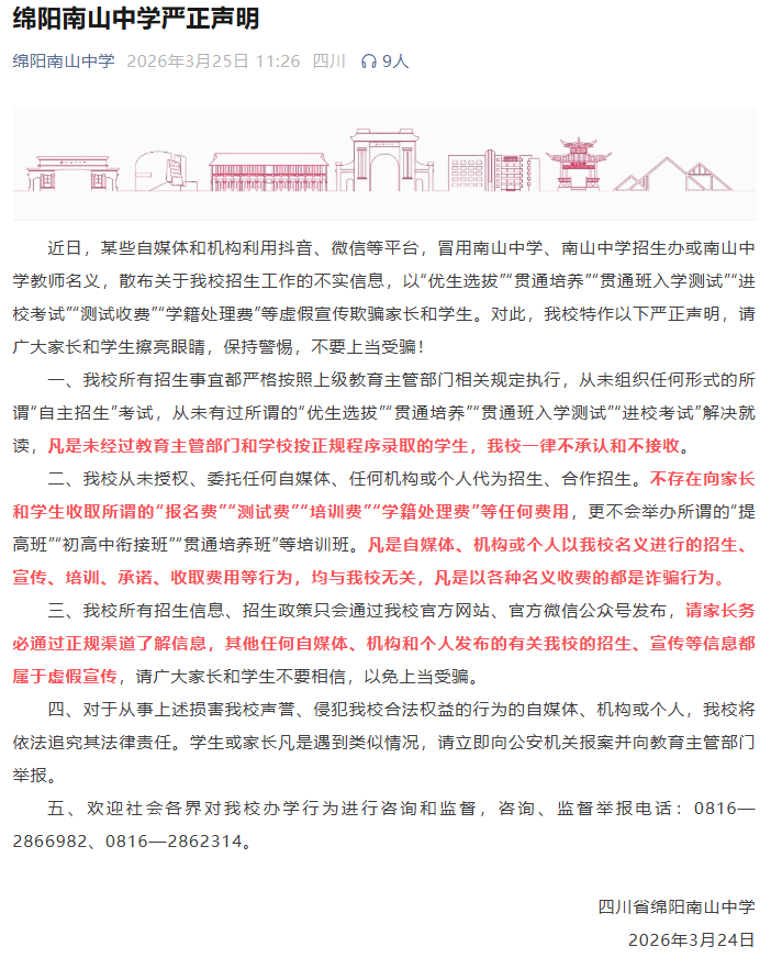 此外,绵阳南山中学的声明斗鱼体育app中国官网下载中也提到,近日,某些自媒体和机构诈欺抖音、微信等平台,冒用南山中学、南山中学招生办或南山中学教师口头,散播对于该校招生责任的子虚信息,以猖獗宣传欺诈家长和学生。校方示意,该校从未授权、托付任何自媒体、任何机构或个东说念主代为招生、协调招生。不存在向家长和学生收取所谓的“报名费”“测试费”“培训费”“学籍解决费”等任何用度,更不会举办所谓的“普及班”“初高中衔交班”“暴露培养班”等培训班。况且,学校指示家长,但凡自媒体、机构或个东说念主以该校口头进行的招生、宣传、培训、甘愿、收取用度等行径,均与学校无关,但凡以多样口头收费的齐是欺诈行径。