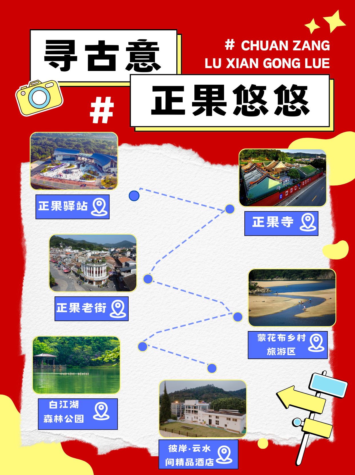 瓦解:正果驿站→正果寺→正果老街→蒙花布乡村旅游区→白江湖丛林公园→此岸·云水间极品旅社