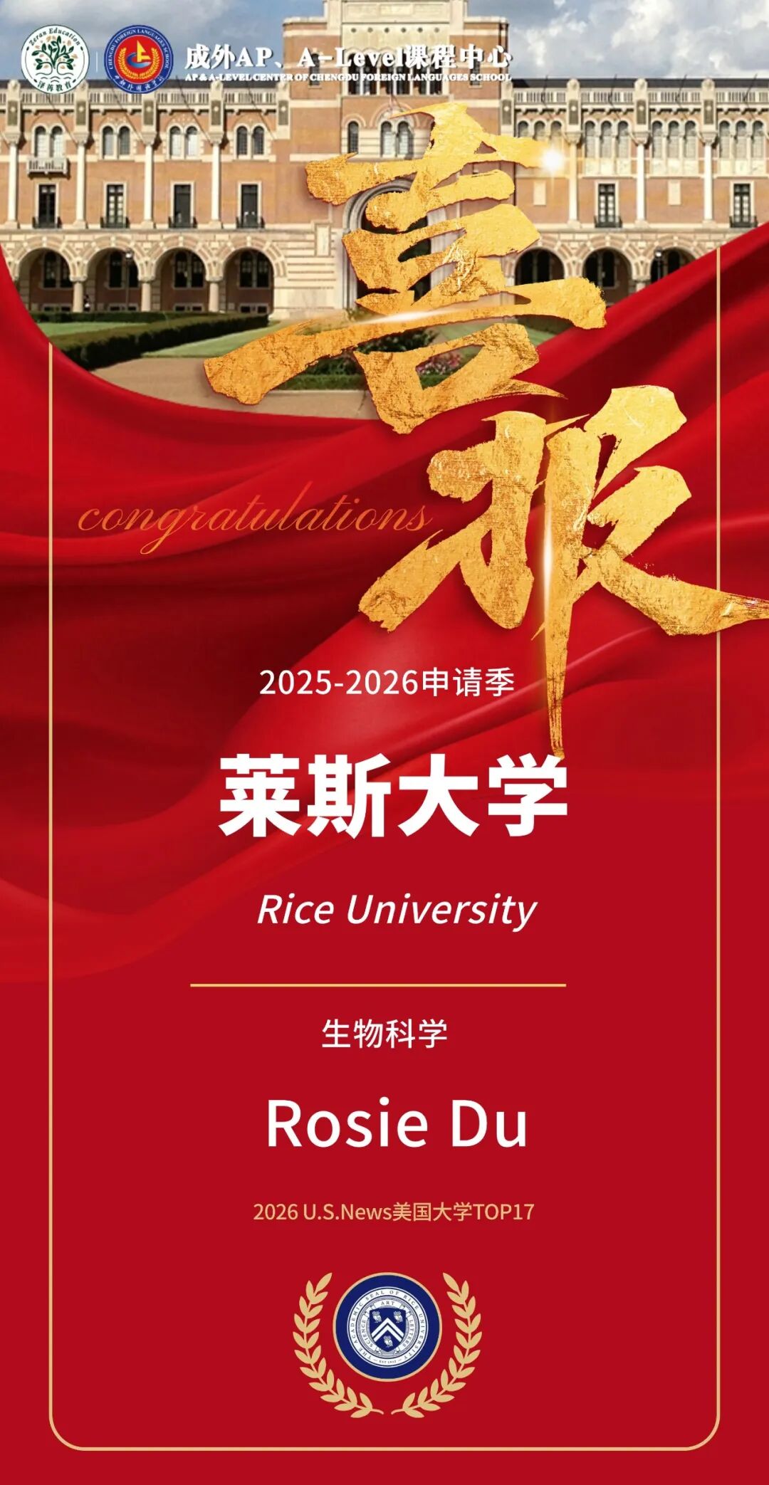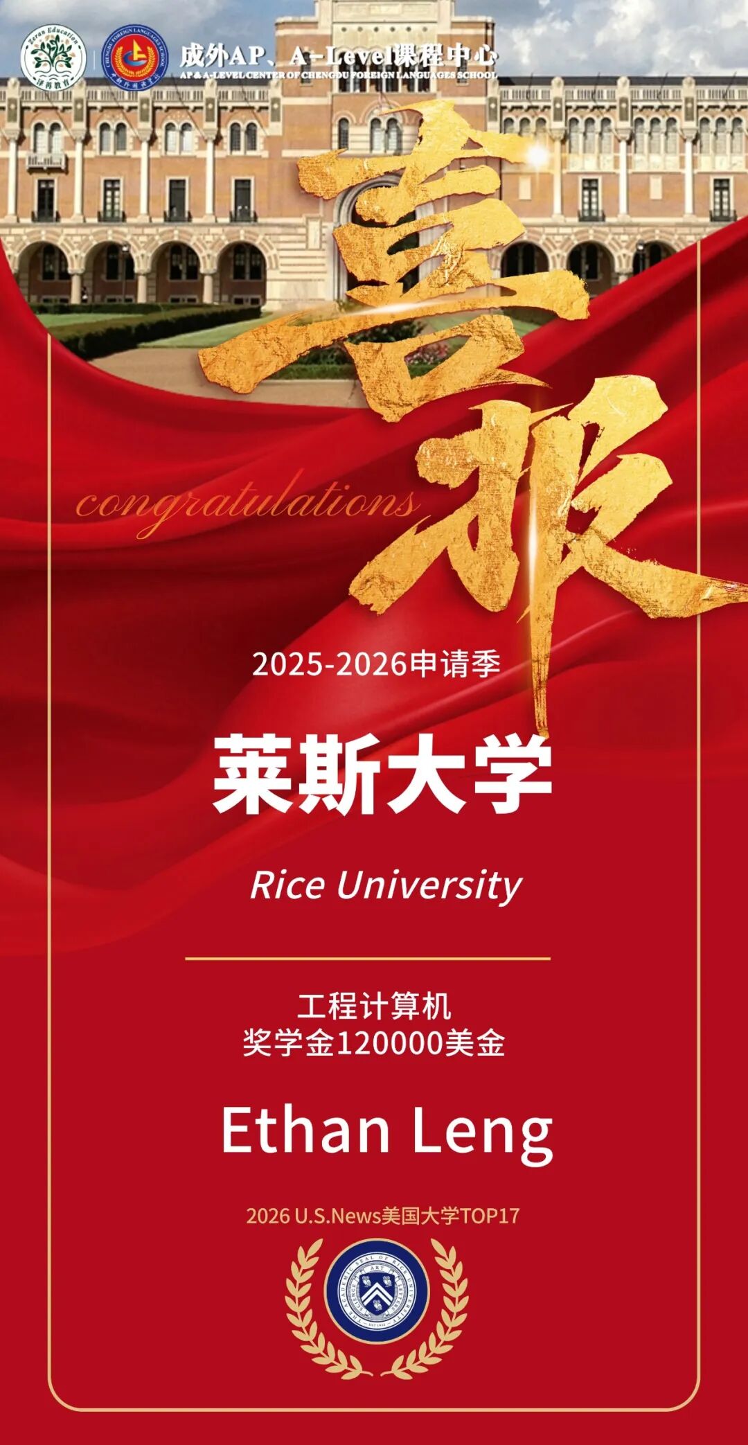 学子斩获录取的乔治·布朗工程学院实力顶尖,其蓄意机科学、蓄意与诈骗数学等形状在全好意思名列三甲。莱斯大学的生物科学专科通常证实稀薄,尤其在神经科学与分子生物学交叉限制展现出塌实的科研造就与改进潜质。热烈祝愿两位学子收效叩开莱斯大学的大门!12万好意思金奖学金的斩获,更是精雕细琢,彰显了莱斯大学对我校学子学术实力与将来后劲的极大详情。
