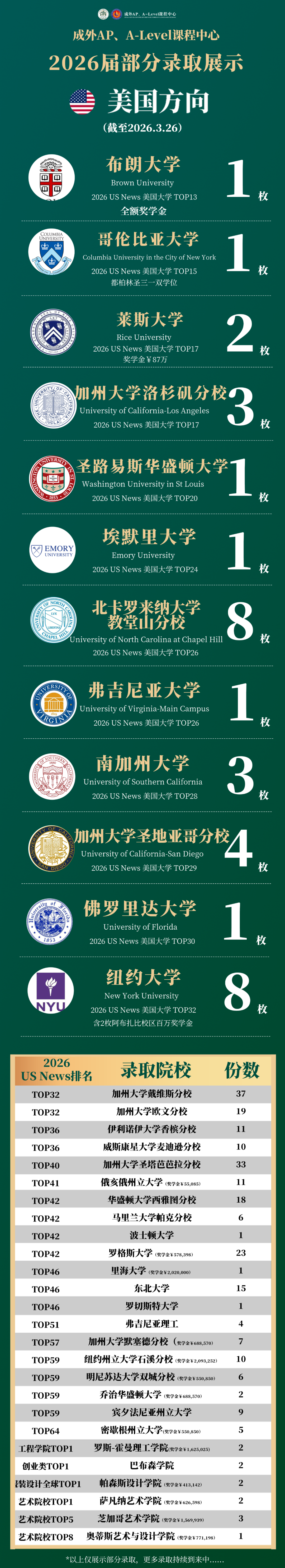 哥伦比亚大学(齐柏林圣三一学院双学位):+1;全好意思排行TOP17,莱斯大学:+2,(其中1枚斩获12万好意思金高额奖学金!);全好意思排行TOP28,南加州大学:+3;全好意思排行TOP32,纽约大学:+3,(其中1枚斩获24,000好意思金奖学金)。限制当今,本届共得益8枚纽大录取(含2枚纽大阿布扎比分校百万级奖学金);顶尖文理学院,维念念大学:+1。