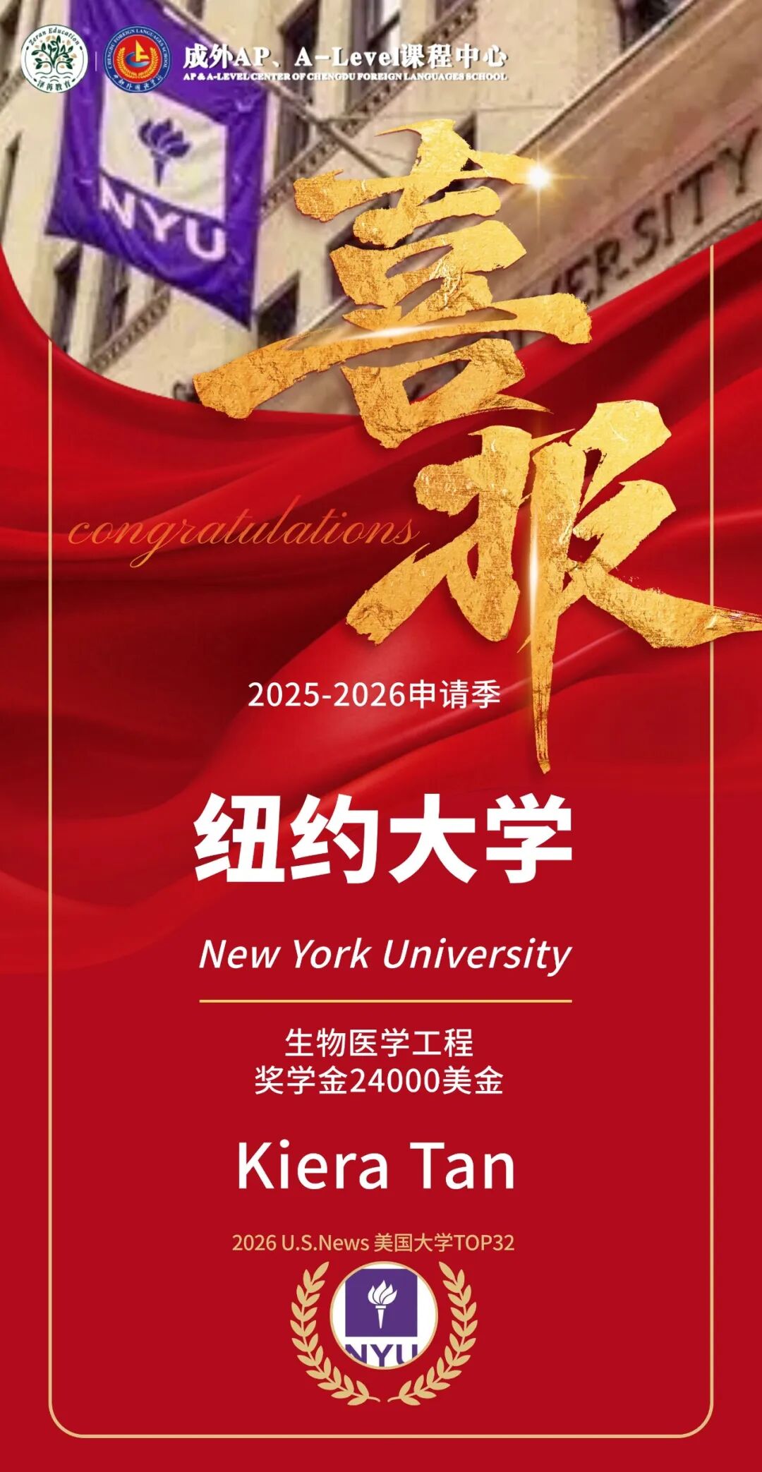 本届再添3枚纽大录取,其中1位学子得到24,000好意思金奖学金,体现了其优秀的空洞教学。限制当今,成外AP、A-Level课程中心2026届学子已累计斩获8枚纽约大学录取见告书(含两枚阿布扎比分校百万奖学金)!这充分证明了中心在培养顺应纽大“巨匠齐市精英”特质东说念主才方面的握续收效和浩瀚实力。