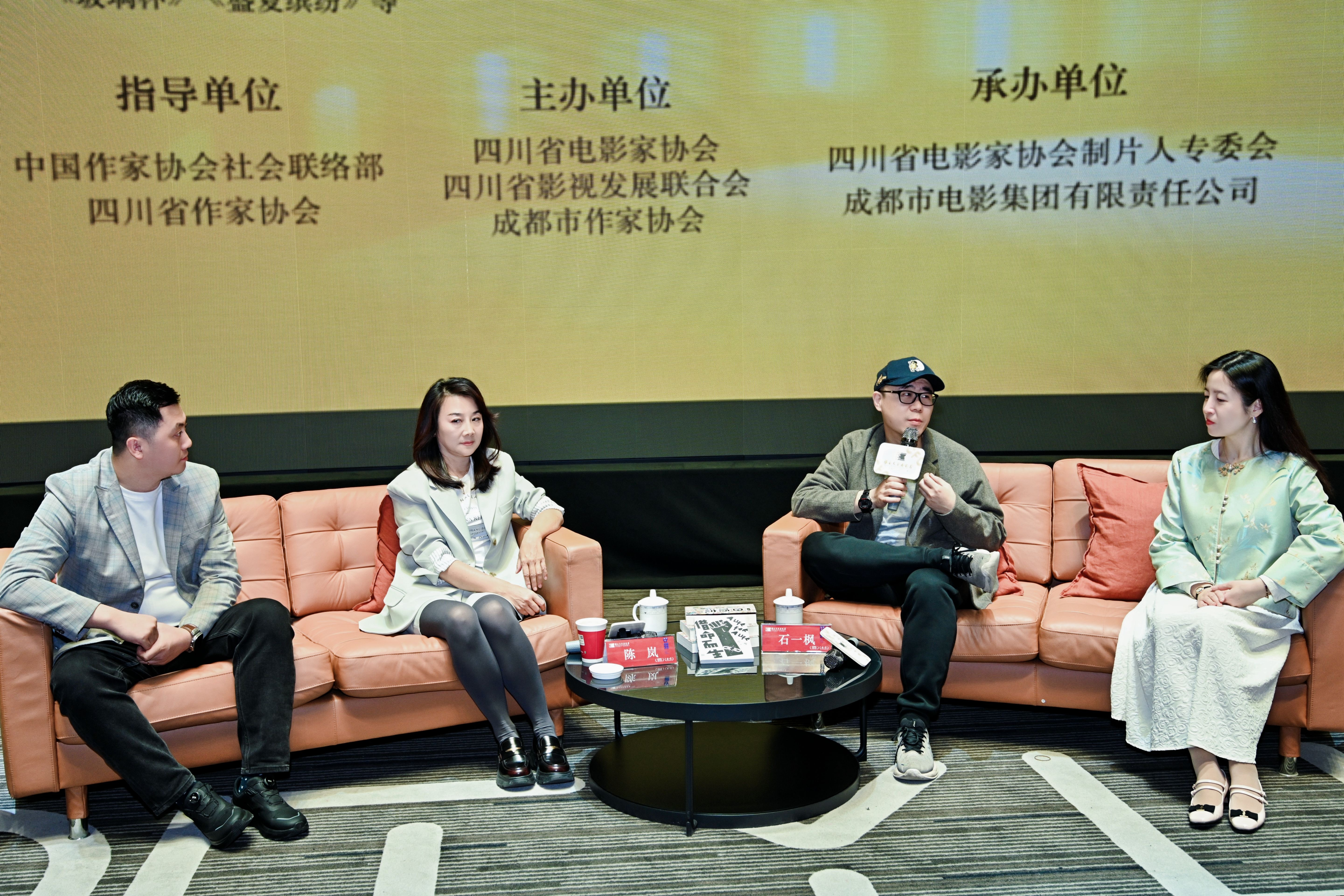 石一枫与闻明编剧陈岚(左二)、成皆电影集团制片东说念主高浩文、后生驳斥家邱田对谈。图据主理方