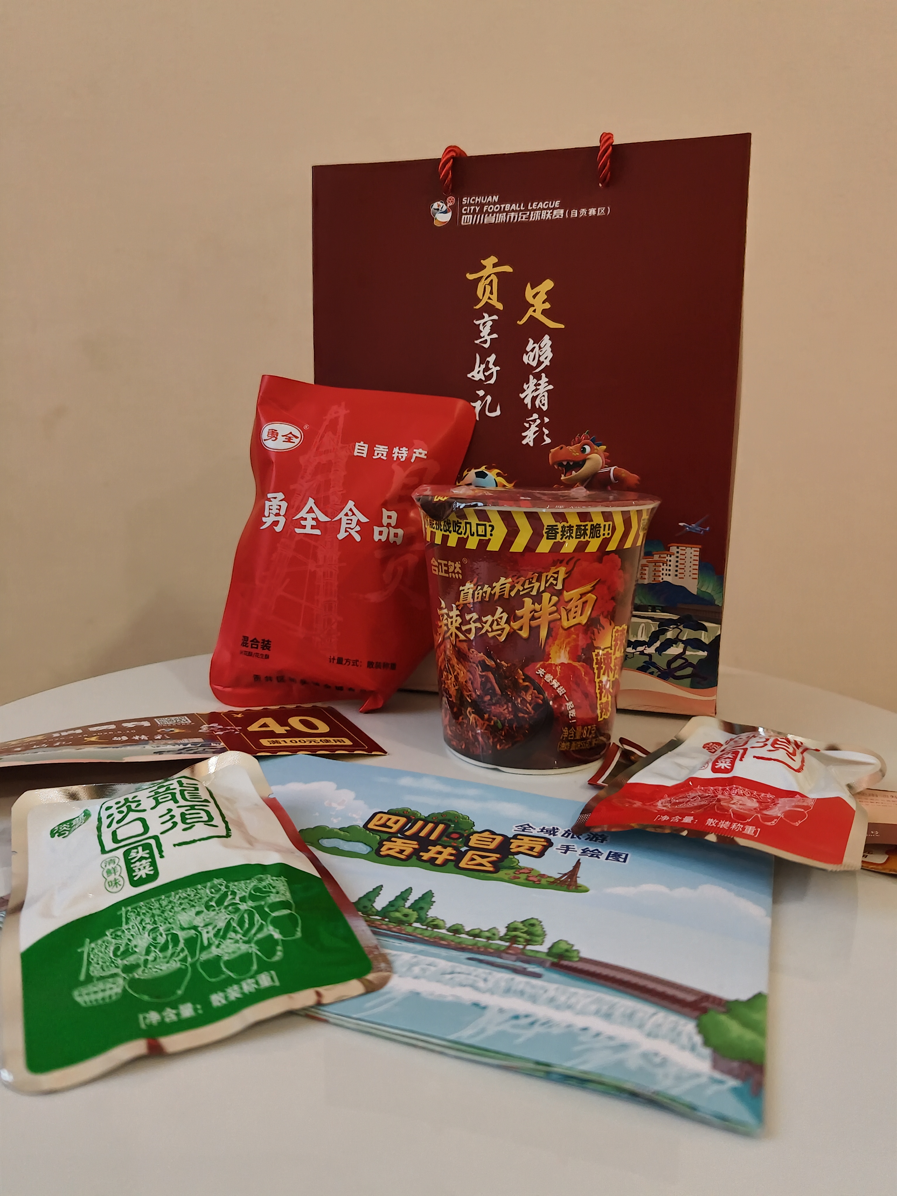 本场比赛,自贡主场还为到场不雅战的2万多名球迷一又友们全心准备了“贡井礼物”:谭八爷麻辣牛肉、火鸡面、泰福大头菜、米花糖和花生酥、贡井文旅舆图以及销耗券,让球迷们大一饱眼福的同期又饱口福。