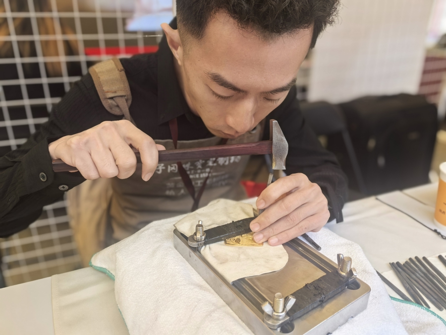 回到现场,95后工匠郭珺文正在演示錾刻——这是打金中最显时期的才能。錾刻台上,金器被固定,他手持小榔头敲击錾刻刀,“叮叮当当”少许少许敲出纹样。“一般要经过几万次,才能达到预期恶果。”他说。摊位前,几位上海大姨凑近仔细围不雅,问谈:“蛮灵,黄金有损耗伐?”